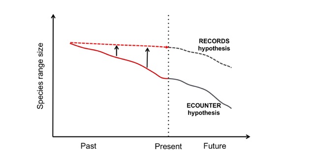 The diagram below illustrates why. It shows trends in the mean range size of newly described species over time. The solid red line shows an apparent decrease in the mean range size of newly discovered species over time as did our data. The encounters hypothesis suggests that the trend will continue into the future (solid grey line) and that more and more of the newly described species will have (on average) smaller ranges.