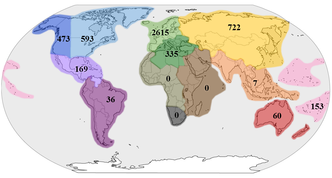 Fig.1. Total number of HAEDAT records in the different OBIS regions of East Coast America, West Coast America, Caribbean Central America, Northern Europe, Southern Europe, Mediterranean, Australia/New Zealand, North Asia and Pacific. The regions of South America, Africa and South East Asia represent key missing data sets. Data as of 1/3/2017. Compiled by Laura Schweibold who worked for 6 months on a GHSR Masters project supervised by G.Hallegraeff.