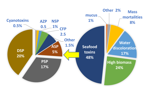 Different regions and countries suffer from different types of HABs, and this is reflected in the way countries/regions enter their data. North America and Europe operate highly sophisticated shellfish toxin monitoring programs. PSP is the dominant seafood toxin syndrome in North America, NSP in the Gulf of Mexico and DSP in Europe. The effectiveness of these monitoring programmes is well reflected in the fact that only an estimated 1 to 10% of toxin-producing blooms lead to human poisonings. In contrast in less well monitored areas such as Australia/New Zealand and Central America up to 50 to 60% of toxin producing algal bloom events can lead to human victims. In the extreme, Pacific HAEDAT data are based exclusively on human ciguatera poisonings diagnosed by medical practitioners.