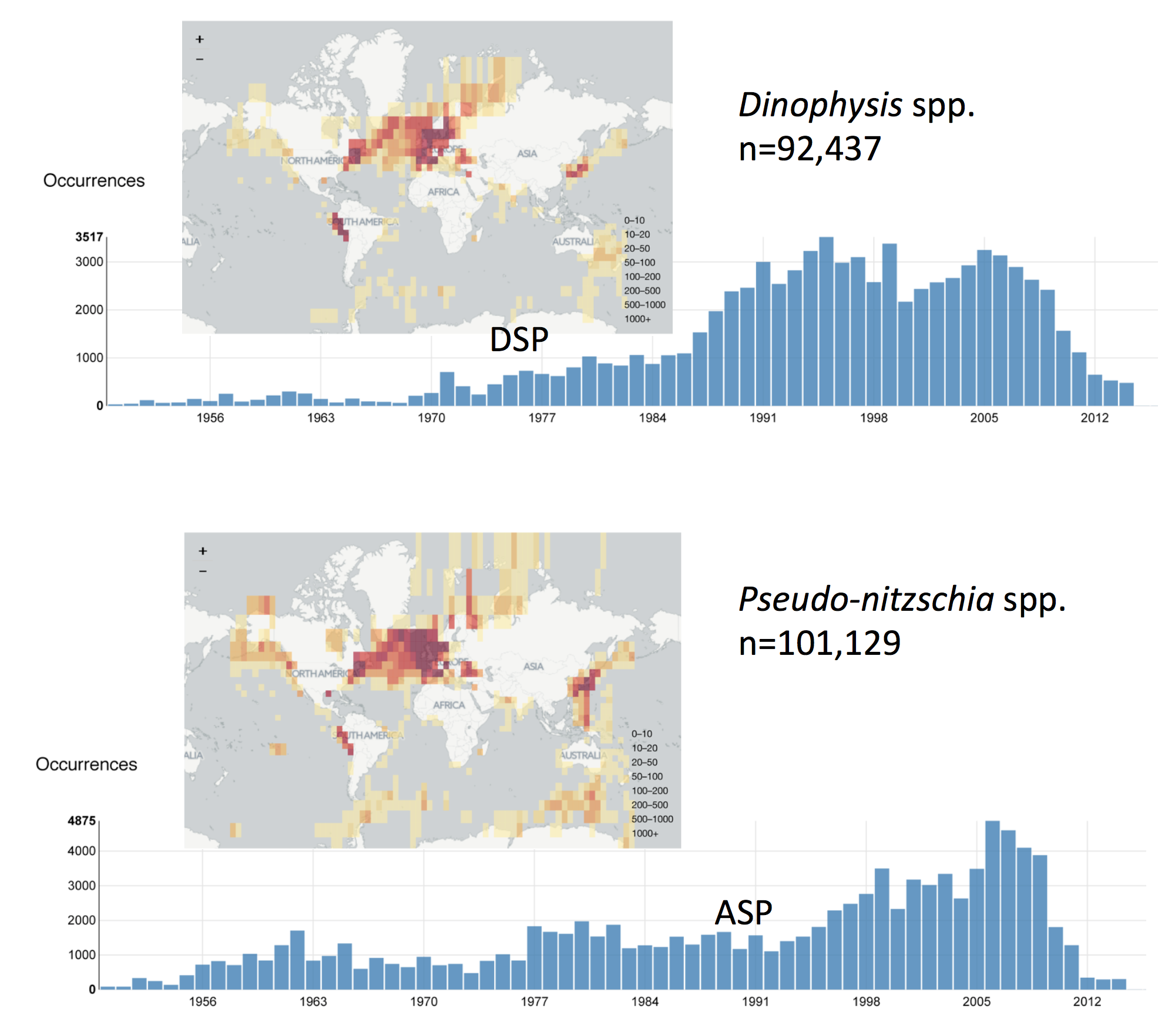 Fig.3. Time series of OBIS location records of the HAB genera Dinophysis and Pseudo-nitzschia between 1950 and 2014, with the time of description of their associated syndromes DSP and ASP indicated. Records are heavily biased towards Europe.