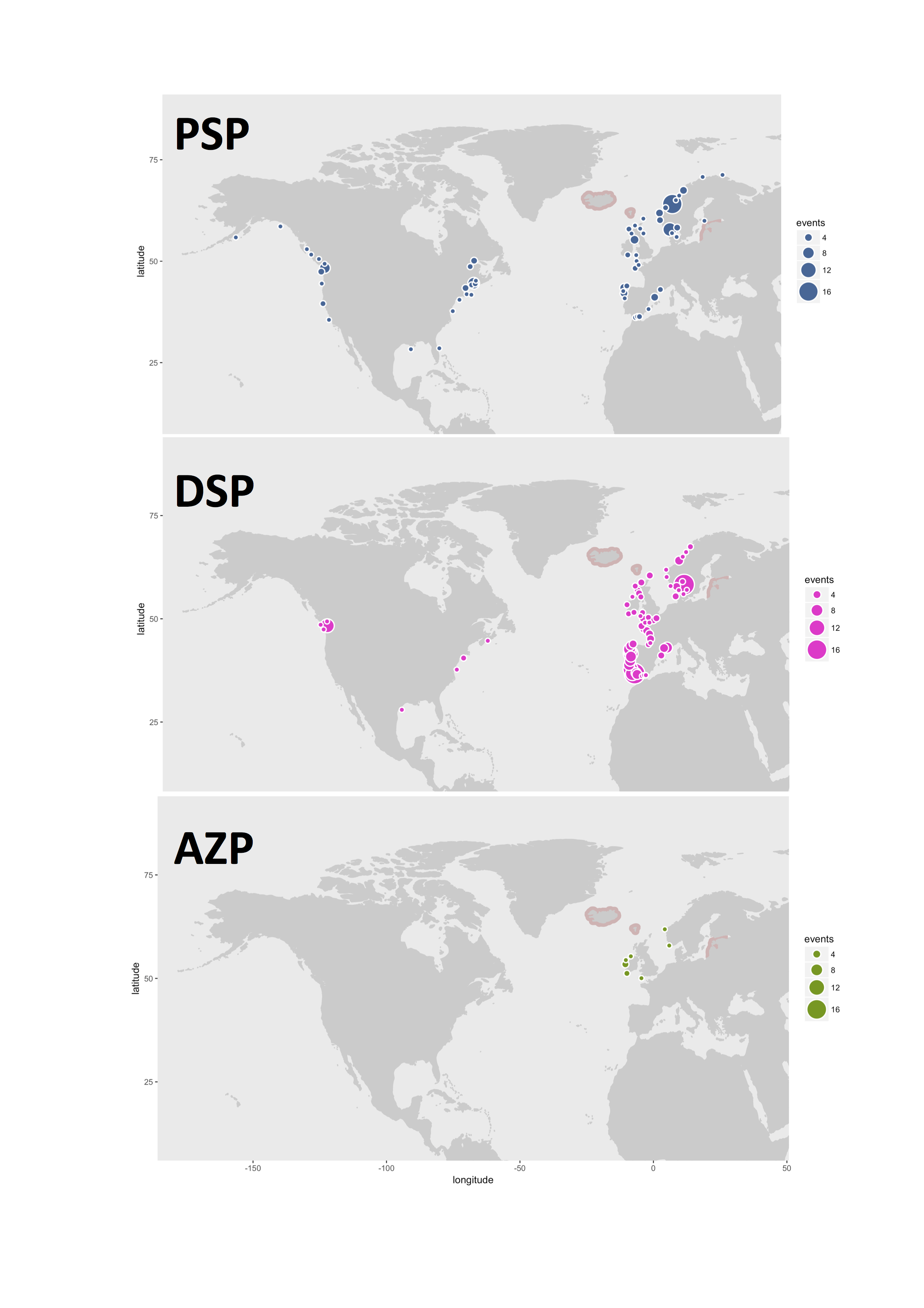 The ICES-IOC Working Group on Harmful Algal Bloom Dynamics (WGHABD) have used HAEDAT to map the distribution of harmful algal events during the period from 2014 to 2016 in the North Atlantic. Examples for PSP, DSP and AZP are presented in Fig 4. These maps highlight the regional aspect to harmful algal events in the North Atlantic area with PSP events recorded across the USA, Canada and Europe during the three year period, a higher incidence of DSP events recorded in Europe, and AZP events restricted to the SW coast of Ireland with a low number also recorded in the UK and Norway.