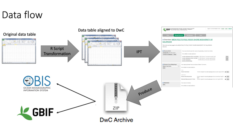 Figure 1. Data flow diagram depicting the pathway of data from original data to data available in the Ocean Biodiversity Information System and the Global Biodiversity Information Facility.
